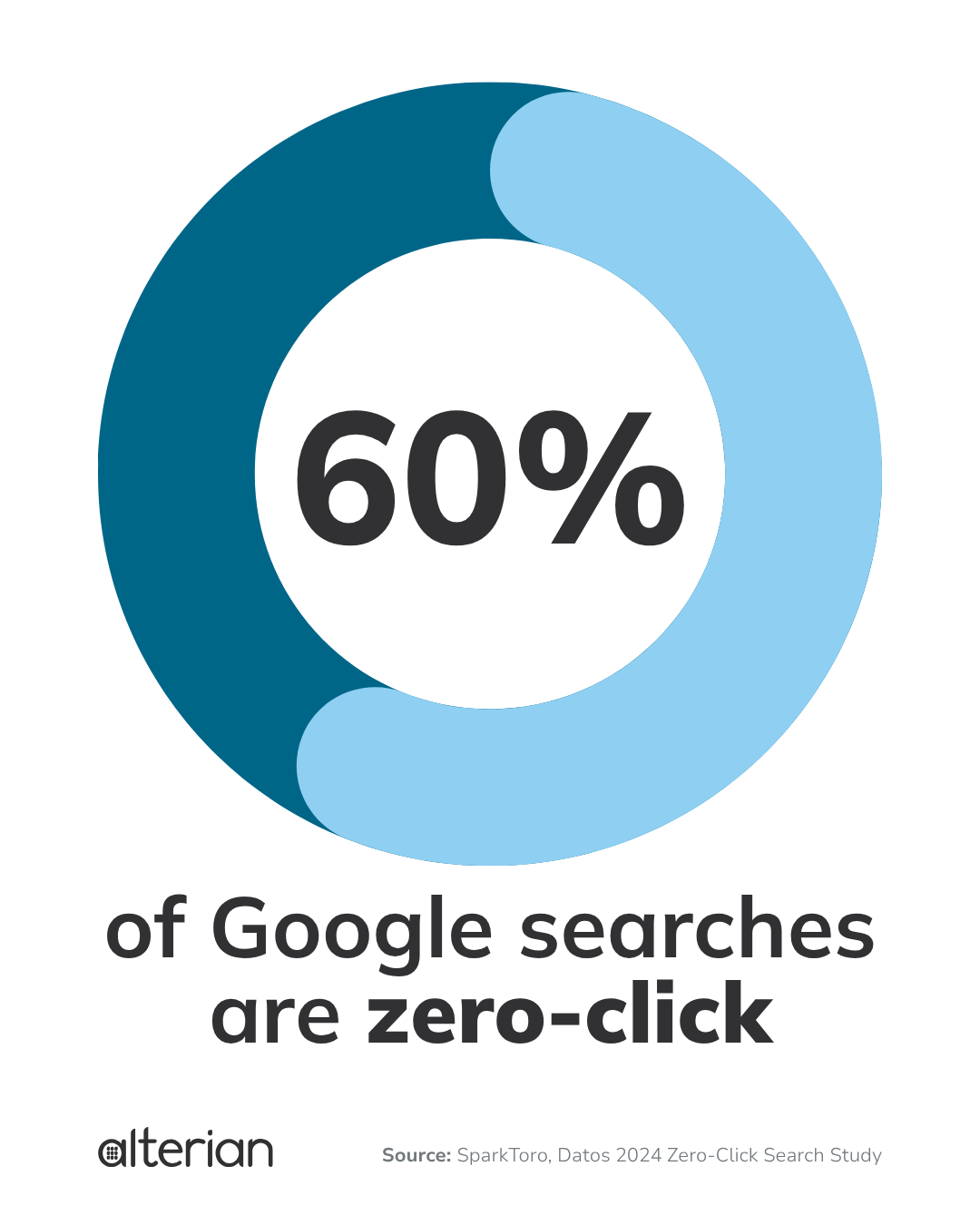 In a 2024 zero-click search study with Datos, SparkToro estimated that about 60% of Google searches in the U.S. and Europe ended without a click to the open web.