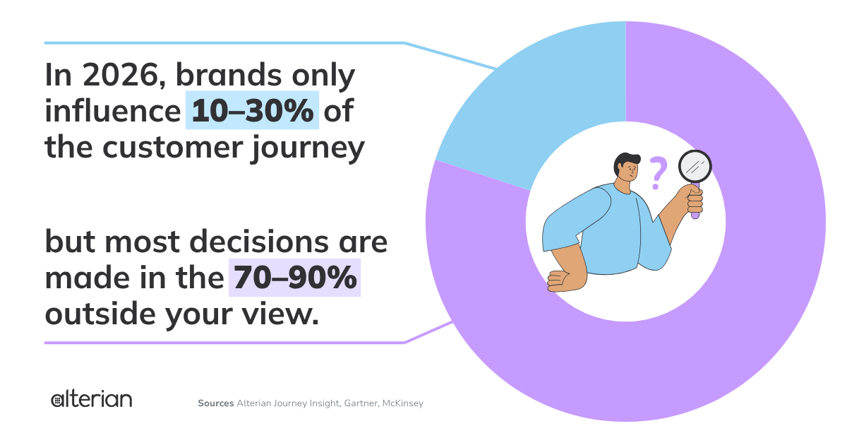 Across industries and market segments, data from Journey Insight shows that only 10–30% of the overall customer journey occurs within brand-owned touchpoints.